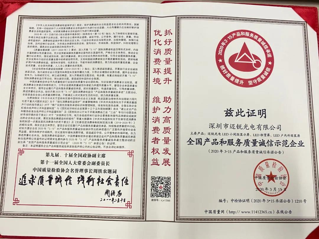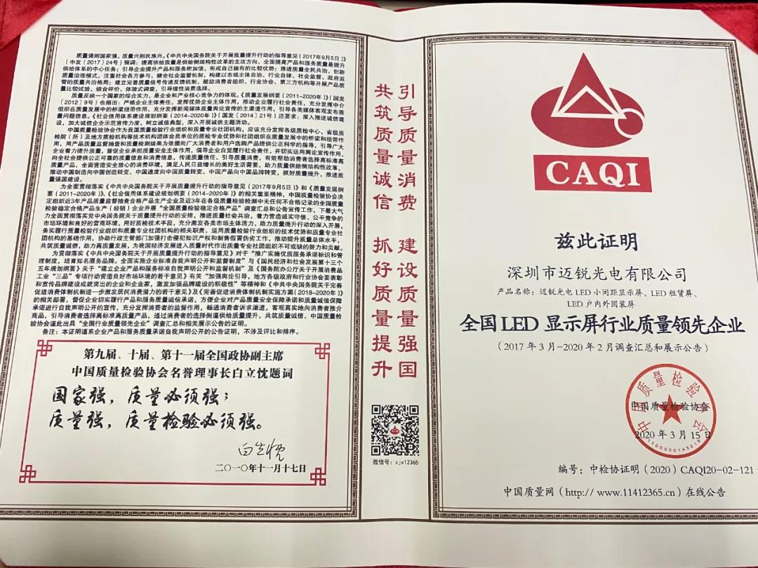 ​mile米乐荣获“LED显示屏行业质量领先企业证书”