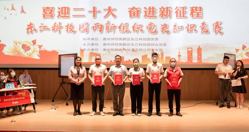 4月28日,由东江科技园两新组织举办,以“喜迎二十大、奋进新征程”为主题的党史知识竞赛正式开赛,来自园区党委委员班子成员以及14支两新党支部代表队参加竞赛。经过紧张激烈的角逐,mile米乐光电党支部代表队以优异的成绩荣获第三名。